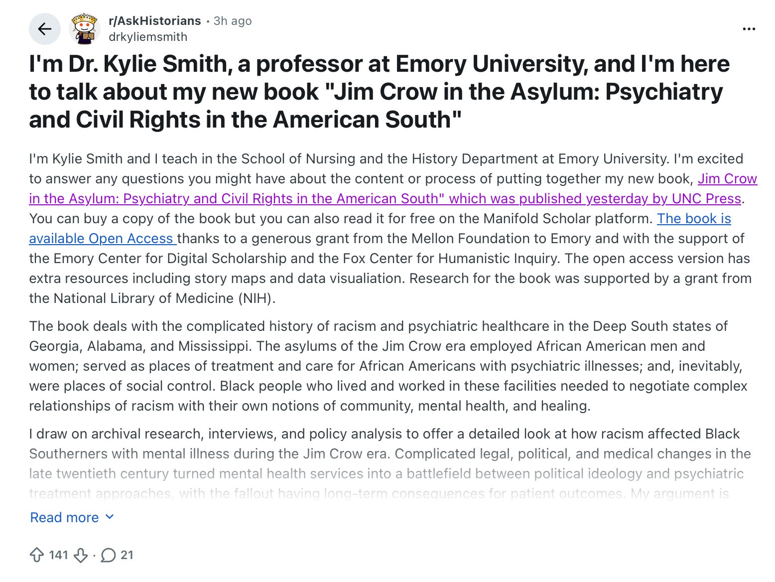 In my day job as a digital marketing manager for the University of North Carolina Press, we’ve been leaning into Reddit AMAs. If you aren’t familiar, an AMA is essentially a digital town hall where someone says, “I know a lot about something, Ask Me Anything!”